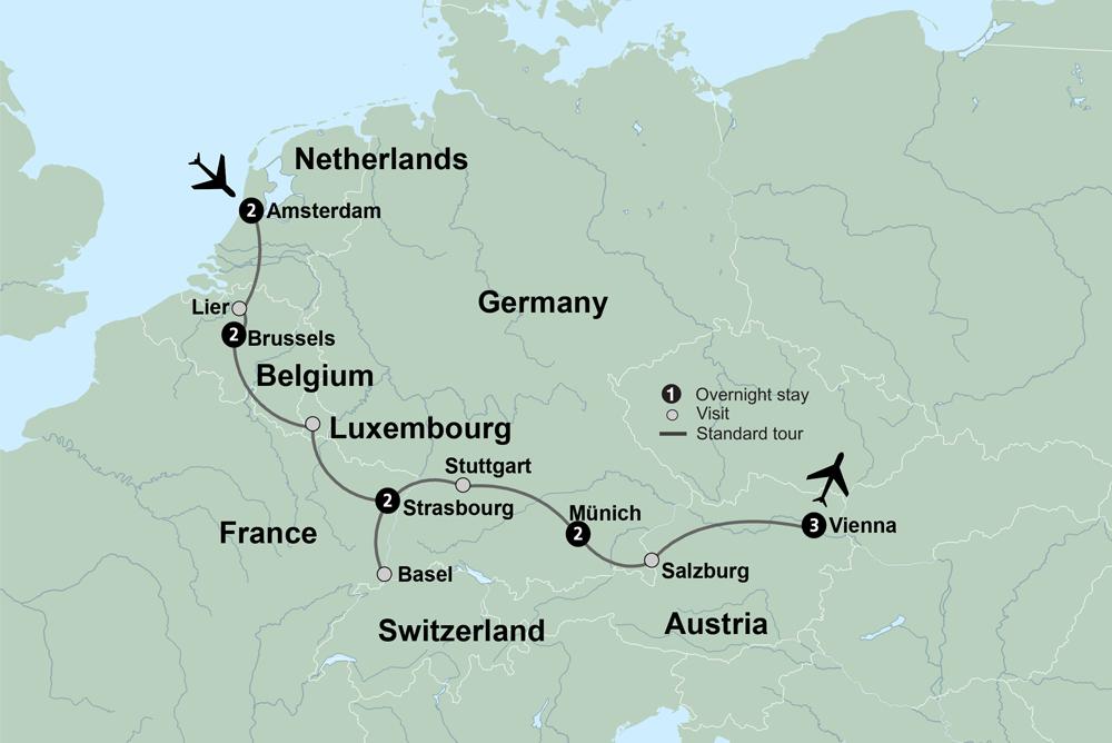 You're on your way to an incredible journey through Europe. The rich culture and cuisine of France, the famed canals of Amsterdam, and the stunning architecture of Vienna are just some of the highlights to come on this tour to seven European countries: Netherlands, Belgium, Luxembourg, France, Switzerland, Germany, and Austria.
